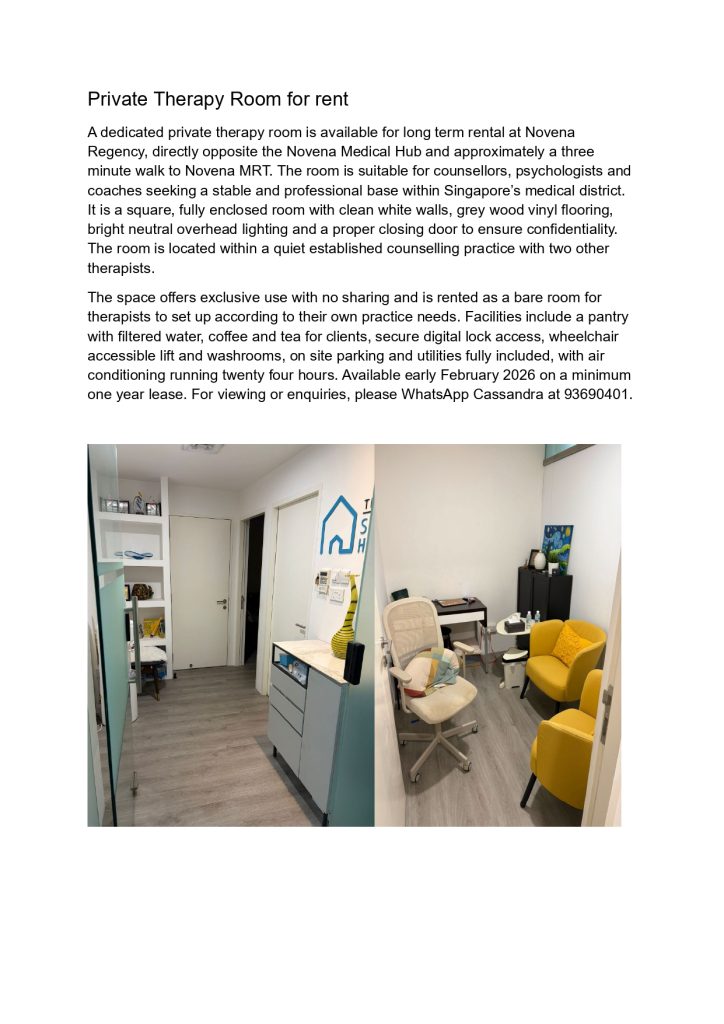 A rare long term private therapy room in Novena Medical District for counsellors and psychologists seeking a quiet, professional practice base
